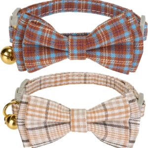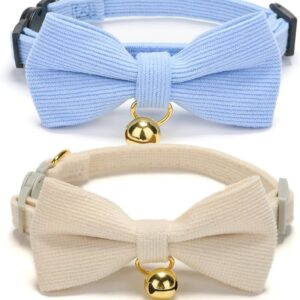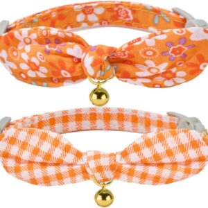2 Pack Soft Corduroy Cat Collars with Bow Tie & Bell, Adjustable Breakaway Cotton Kitty Bowtie Collar for Girl Boy Kitten (Orange & Green)
