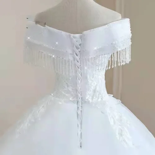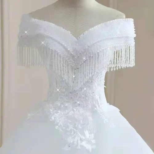 New Fashion Luxury Off Shoulder V Neck Ball Gown Wedding Dress Crystal Beaded Tassel Plus Size Bridal Gown With Long Tail